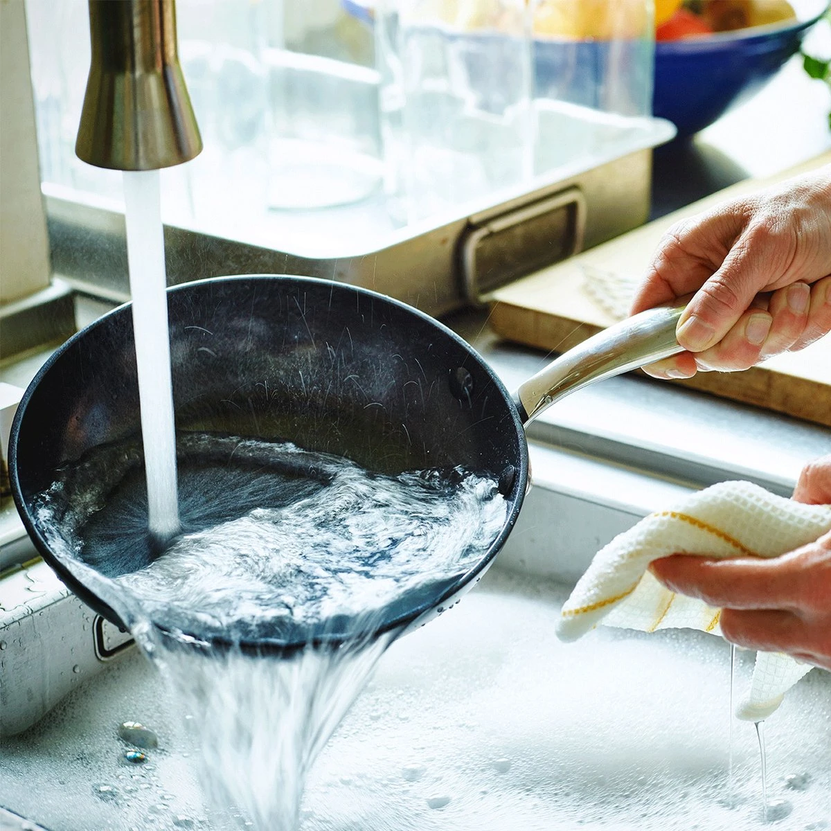 - De koekenpan mag in de vaatwasser, maar afwassen met de hand is aanbevolen voor een optimaal behoud van de keramische anti-aanbaklaag.
