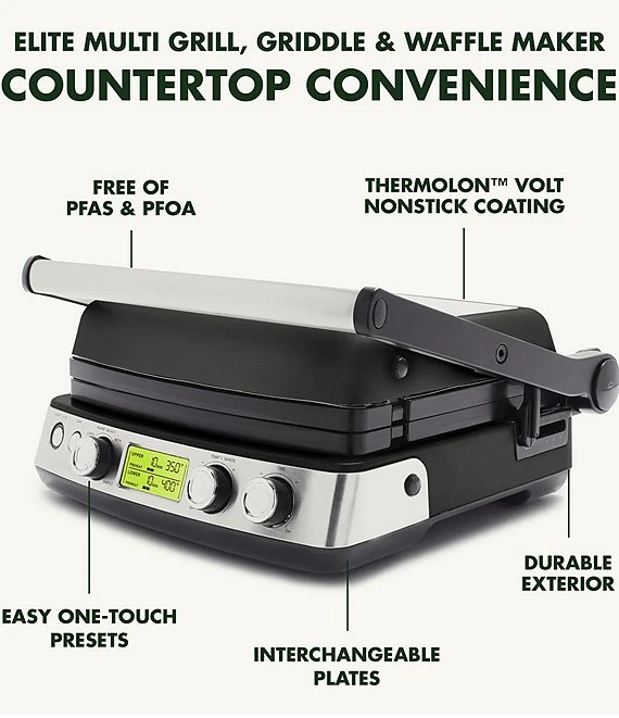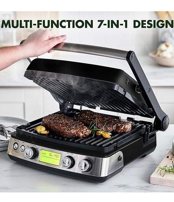 - 7-in-1 Design: Contact grill, panini press, grill and griddle, grill on one side, griddle on the other, plus real waffles